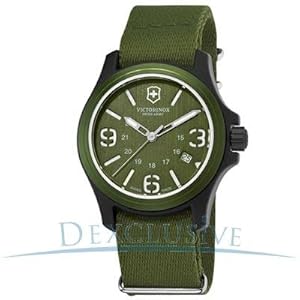 Swiss Army Watches reflect the ingenious design and outstanding durability Victornox has come to stand for over the years. Uncompromising craftsmanship makes these watches worthy to carry the "cross and shield" emblem that symbolizes the legend of Victornox and the Swiss Army Brand. Whether you're going around the corner or around the globe; classically styled Swiss Army watches will make sure that you're equipped for life's adventures. No matter what those adventures might be.Band Color: Forest Green Nylon; Band Width: 20mm near case; 19mm near clasp/buckle; Bezel Color: Forest Green; Case: Black + Circle-shaped; Case Finish: Flat + Aluminum; Case Thickness: 13mm; Case Width: 40mm; 44mm with crown; Clasp / Buckle: Strap Buckle; Dial: Forest Green + analog; Hand Color: Silver; Movement: Swiss + quartz; Time Zones: Single; Water Resistance: 10 atm; Other Features: Date Display